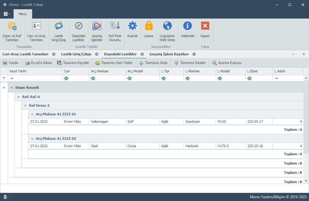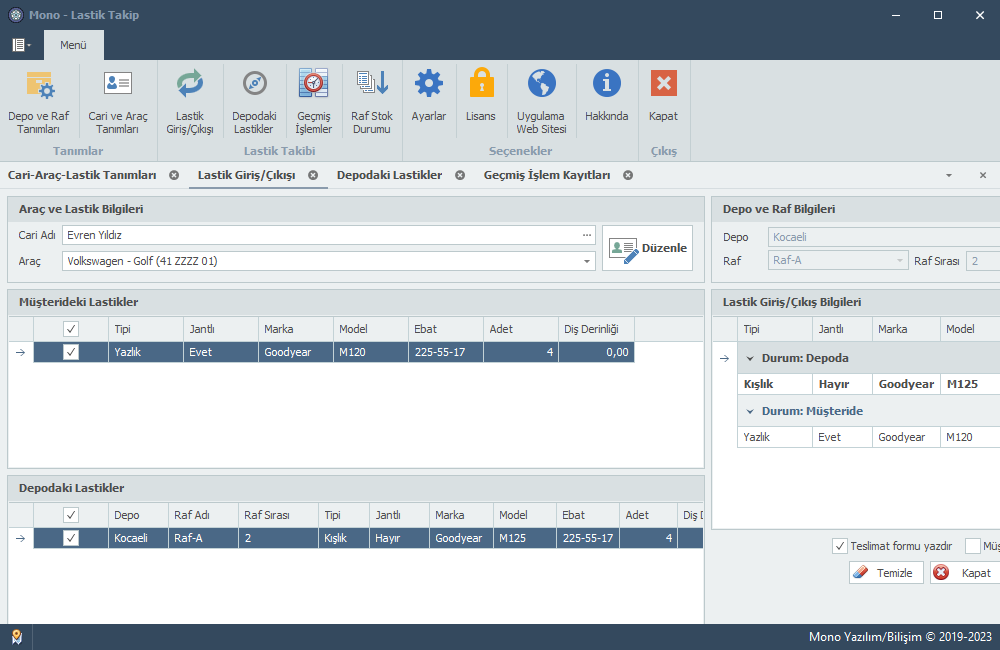 Mono Tire Tracking bir lastik saklama-stoklama takip programıdır. Deponuzda bulunan müşterinizin araçlarına ait yazlık-kışlık lastikerin takibini bu uygulama ile yönetebilirsiniz.